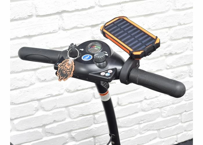 We paired the power bank/charger with our universal grip smartphone holder that is fully adjustable to grip your bike or scooter’s handlebar (or “tiller”). It may even be secured onto a wheelchair or power chair’s armrest bracket. The mounting is extremely adaptable to just about any bike or mobility vehicle with a handlebar, tiller, or bracket. We call it “universal” because of the truly wide range of modern electronic devices this holder will carry for you. The best part is that this holder offers a wide range of adjustment; you put it where you want it and your power bank/charger stays right at your fingertips.
